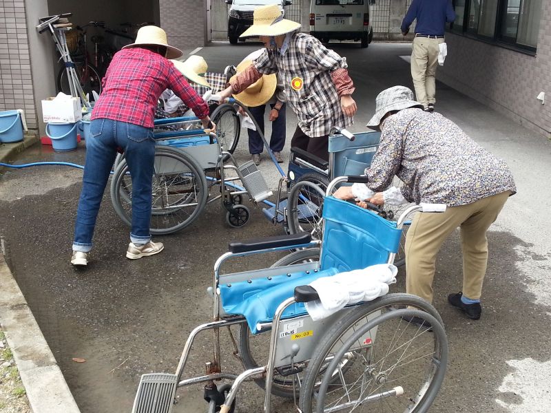 車いすを、1台1台ていねいに洗っていただきました。